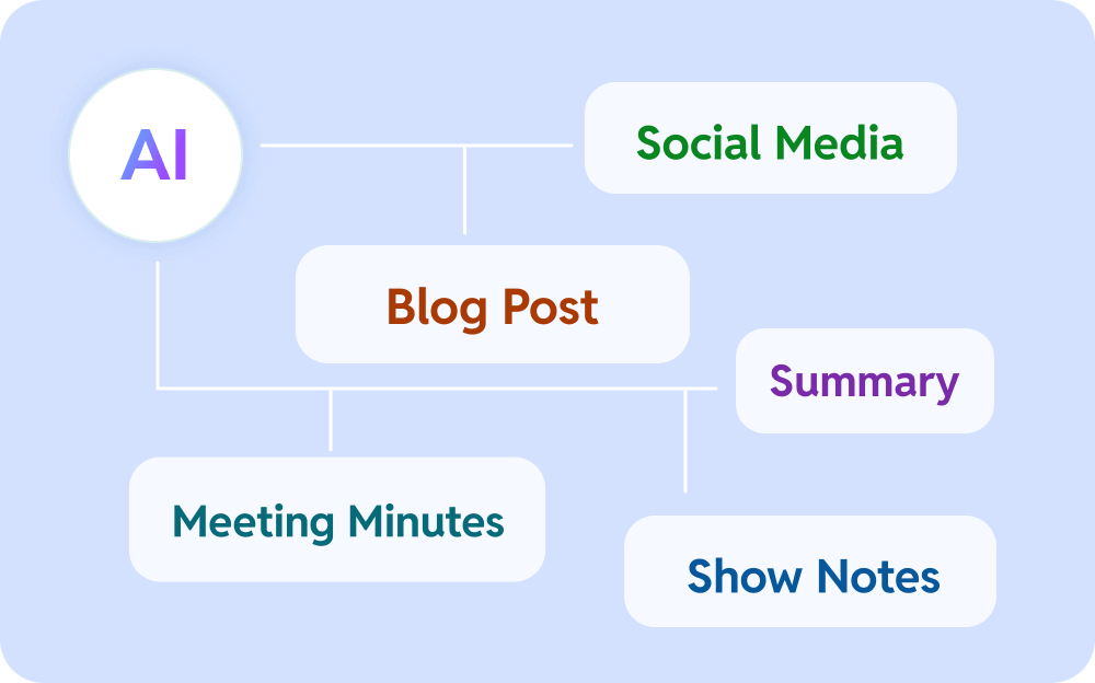 Instantly repurpose your transcripts into summaries, notes, blog posts, meeting minutes, and much more — all in just a few clicks.